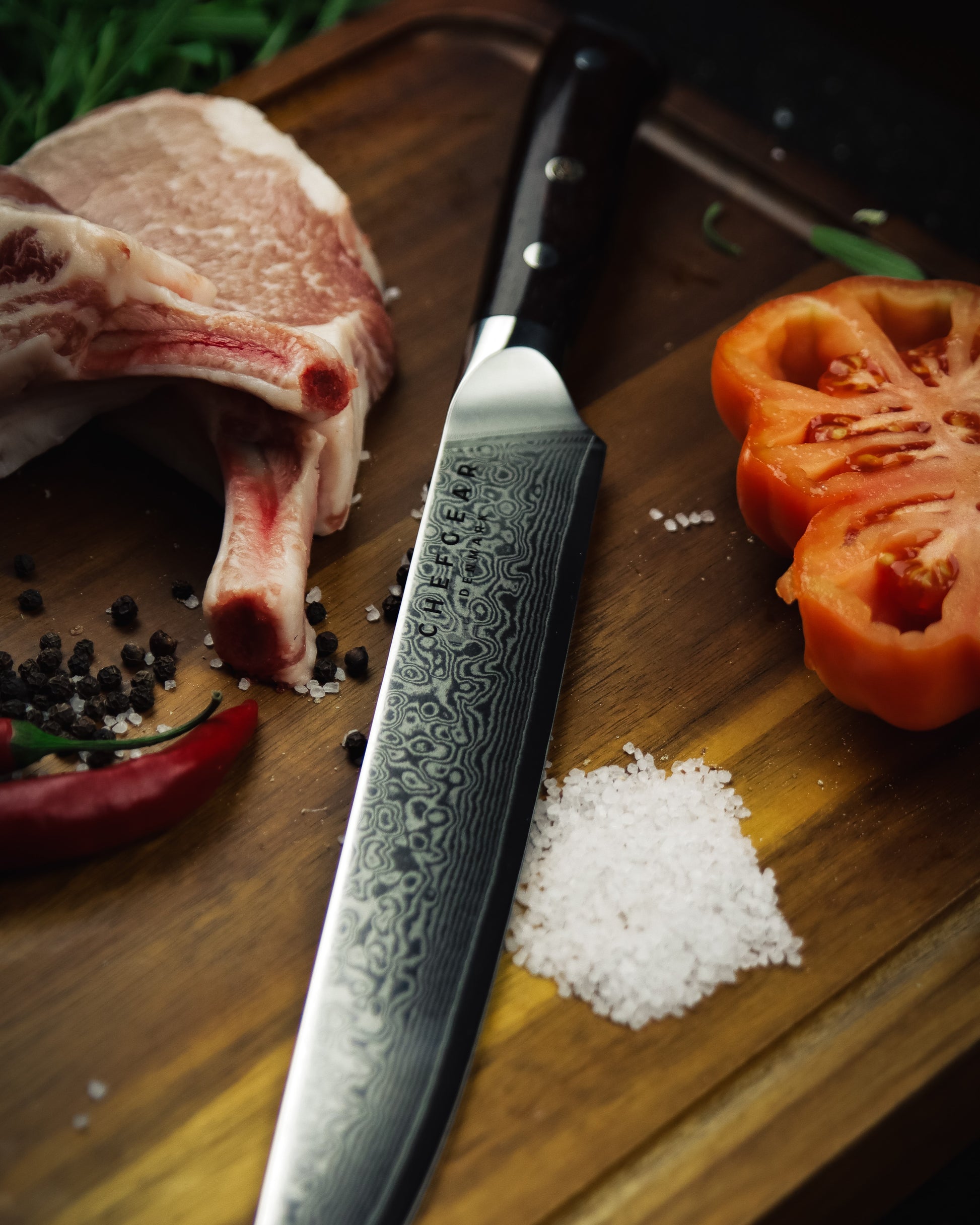 - Stål: 67 lags stål, smedet efter Damaskus metoden med kerne af VG-10 stål