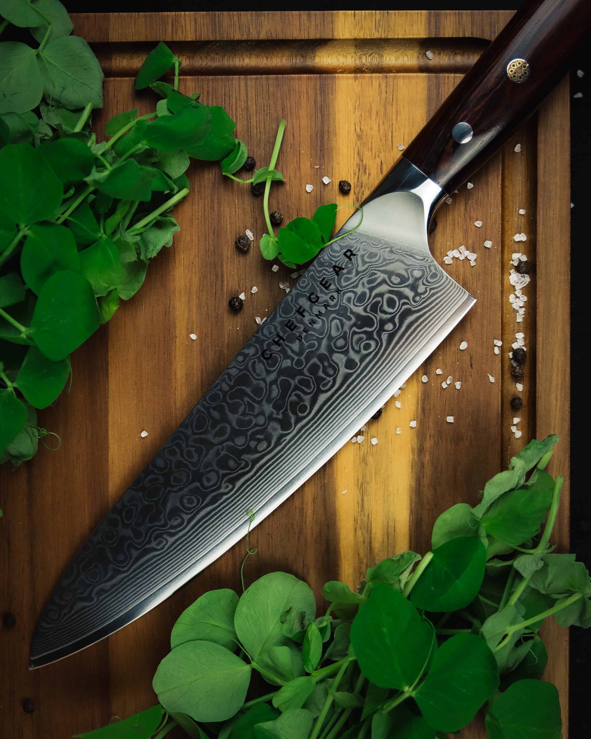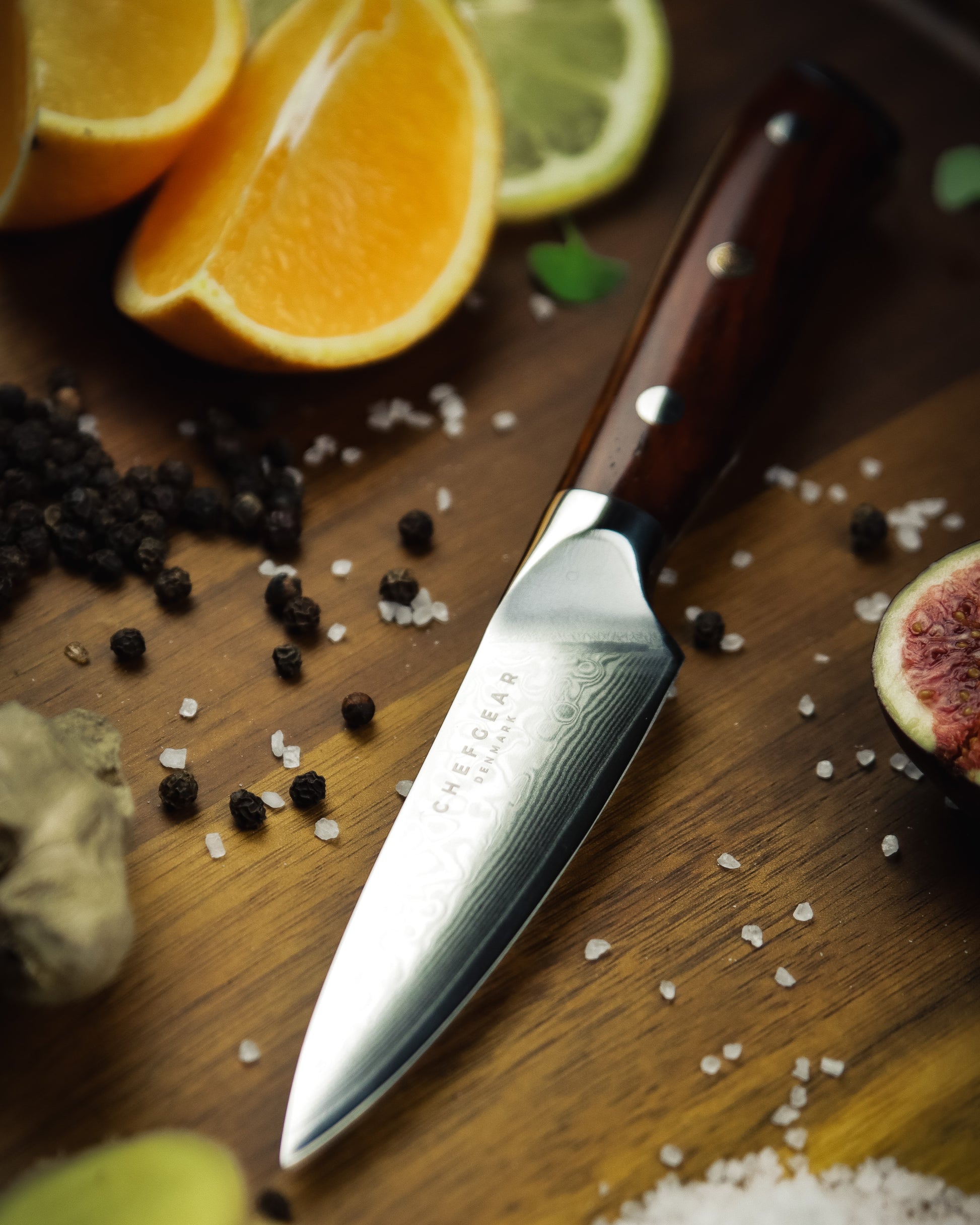 Knivene er lavet af i VG-10 stål af høj kvalitet, hvilket sikrer lang levetid og optimal skæreydelse. Skafterne er lavet af naturligt rosentræ der sikrer dig et behagligt greb, når du laver mad.